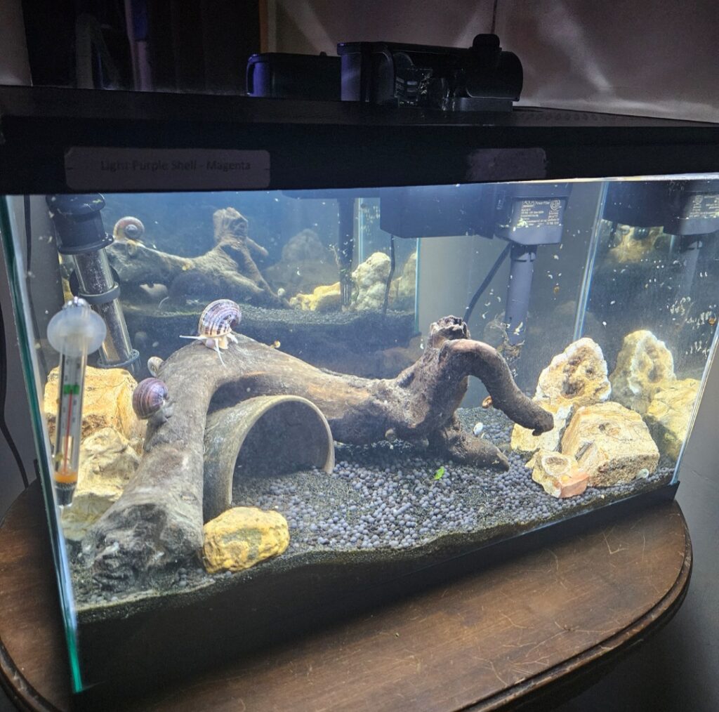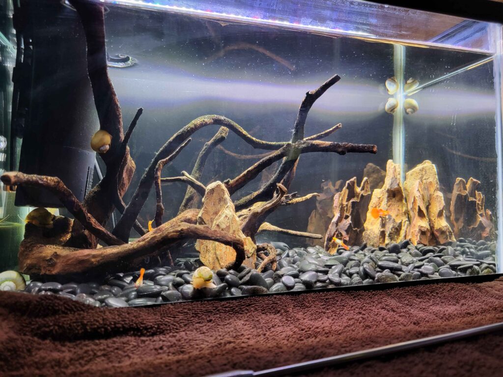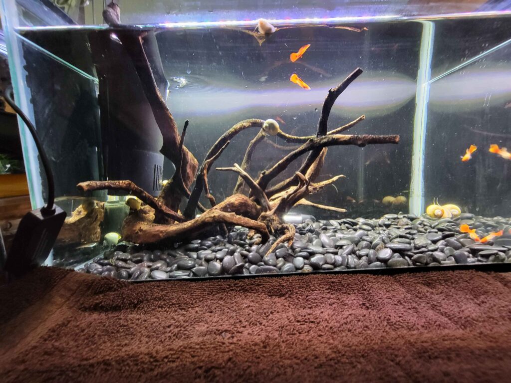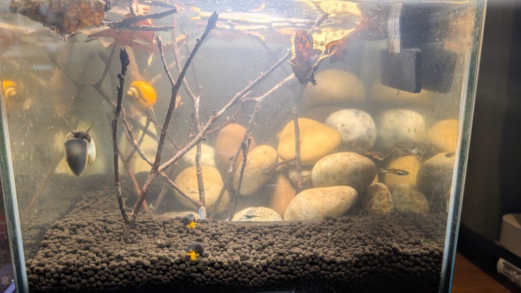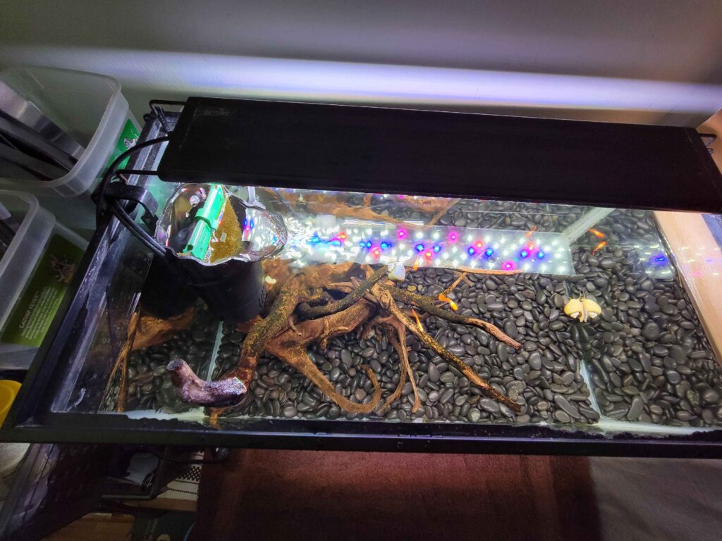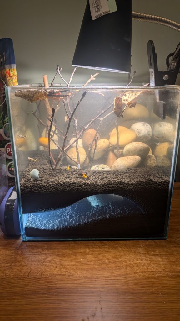 This is a 10 gallon tank that was set up on 10/15/25. The picture was taken a couple days after that. I set it up with intentions for this contest and then didn't even submit it by the deadline. (WoW I know) It had 2 mystery and ramshorn at that moment. I ended up putting in pea puffers that I got from Carl at the swap. The tank itself was also a trade amongst someone in the hobby. It is now, months later, FILLED with plants. (Sorry not sorry, it looks great)