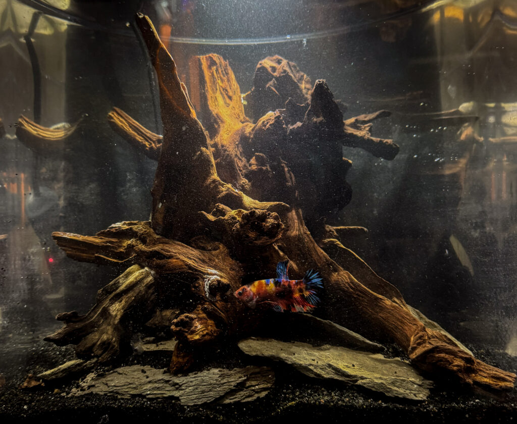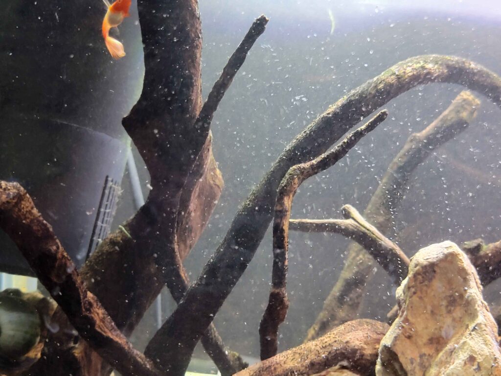 This is a 3.5" "halfmoon" tank turned backwards. It allowed for a cool sense of depth that is very hard to photograph! I tried to follow the standard formula of sloped substrate, contrasting rocks, topped with wood. I should have REALLY stuck to the formula and used a tank with no curves, at least for a tank that photographs well. Also didn't get all the bubbles off after filling! Shesh.