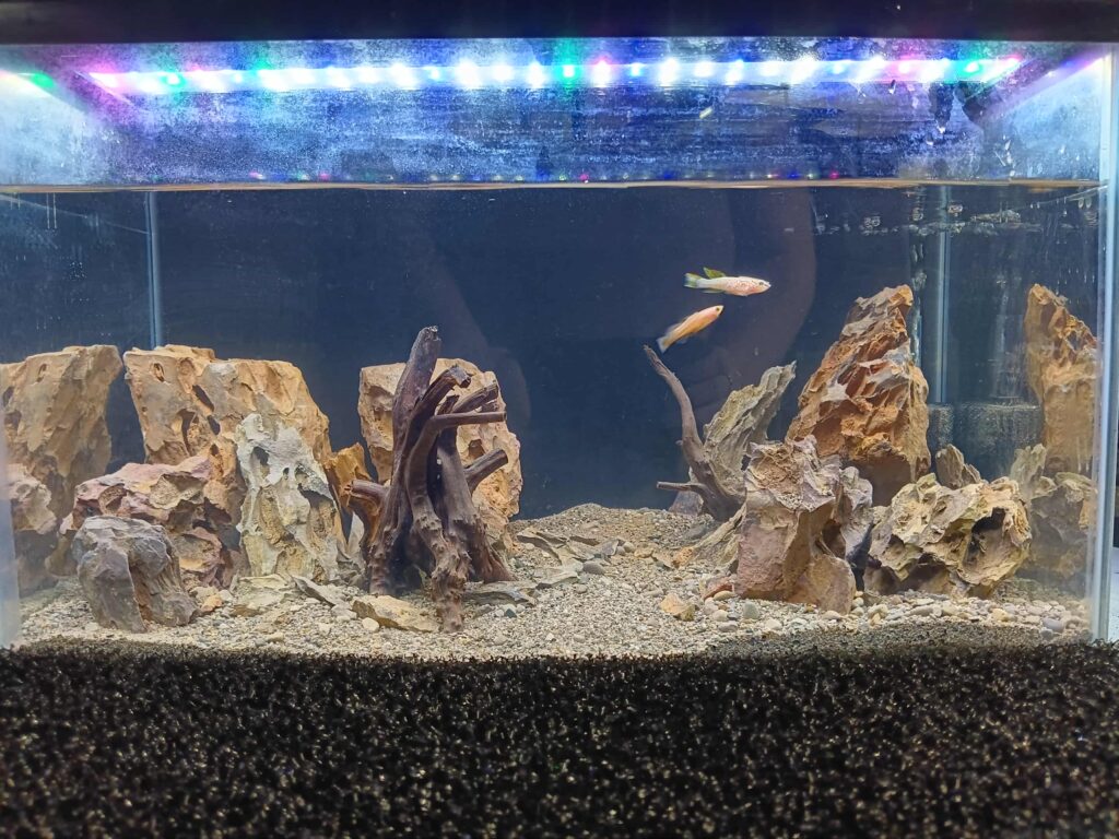 10 gal, 3 koi guppys and red bnp all from matherfish. New Rock from temu, driftwood from rainbow tank build, and some snails I bred.